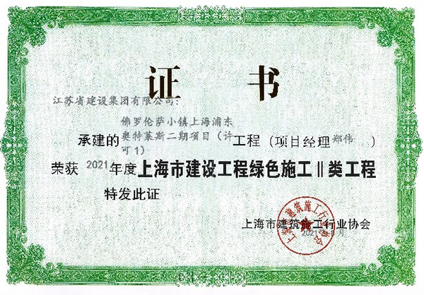 佛罗伦萨小镇项目获得上海市绿色施工II类工程奖